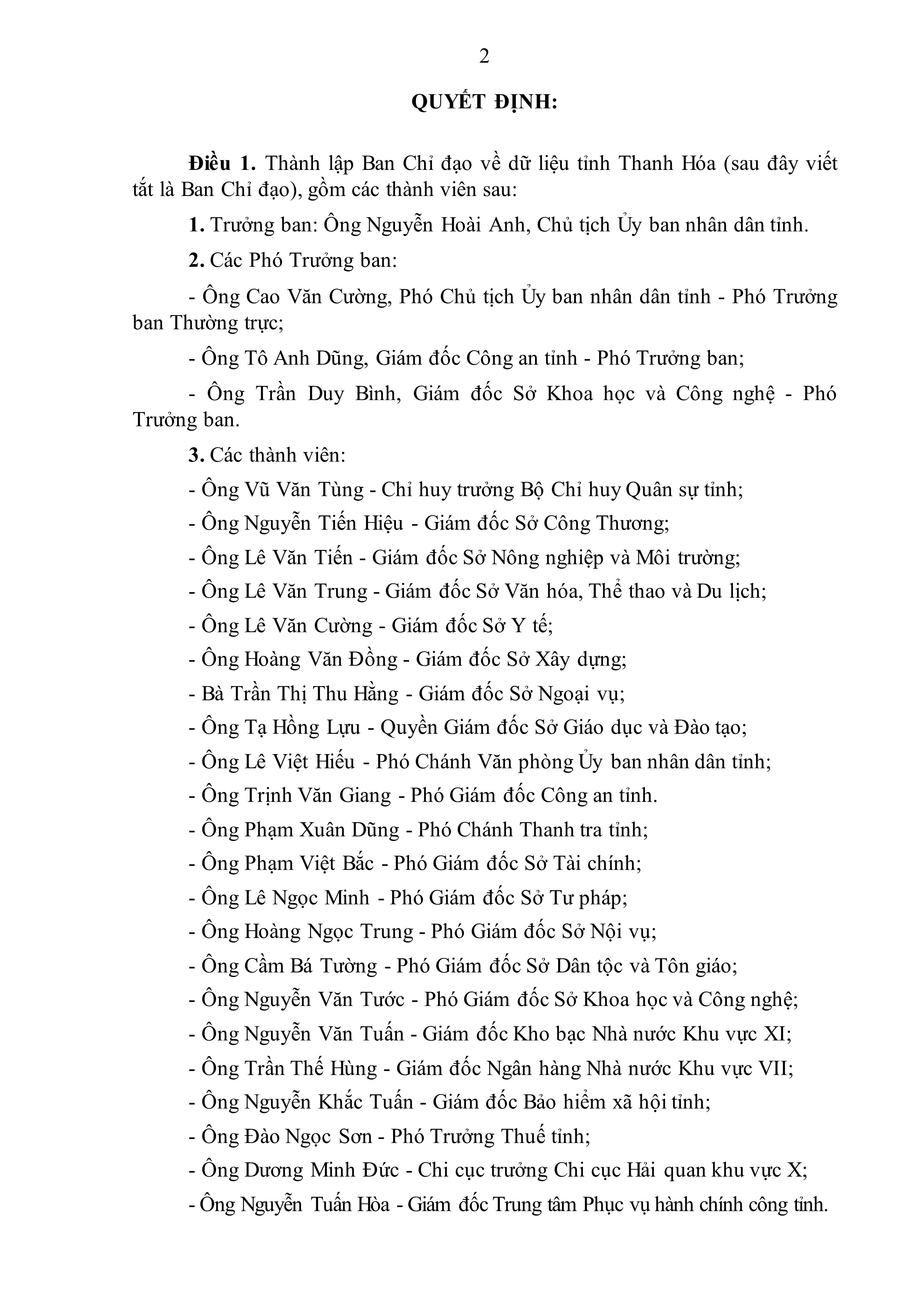 Các Phó Trưởng ban gồm: ông Tô Anh Dũng, Giám đốc Công an tỉnh; ông Trần Duy Bình, Giám đốc Sở Khoa học và Công nghệ.