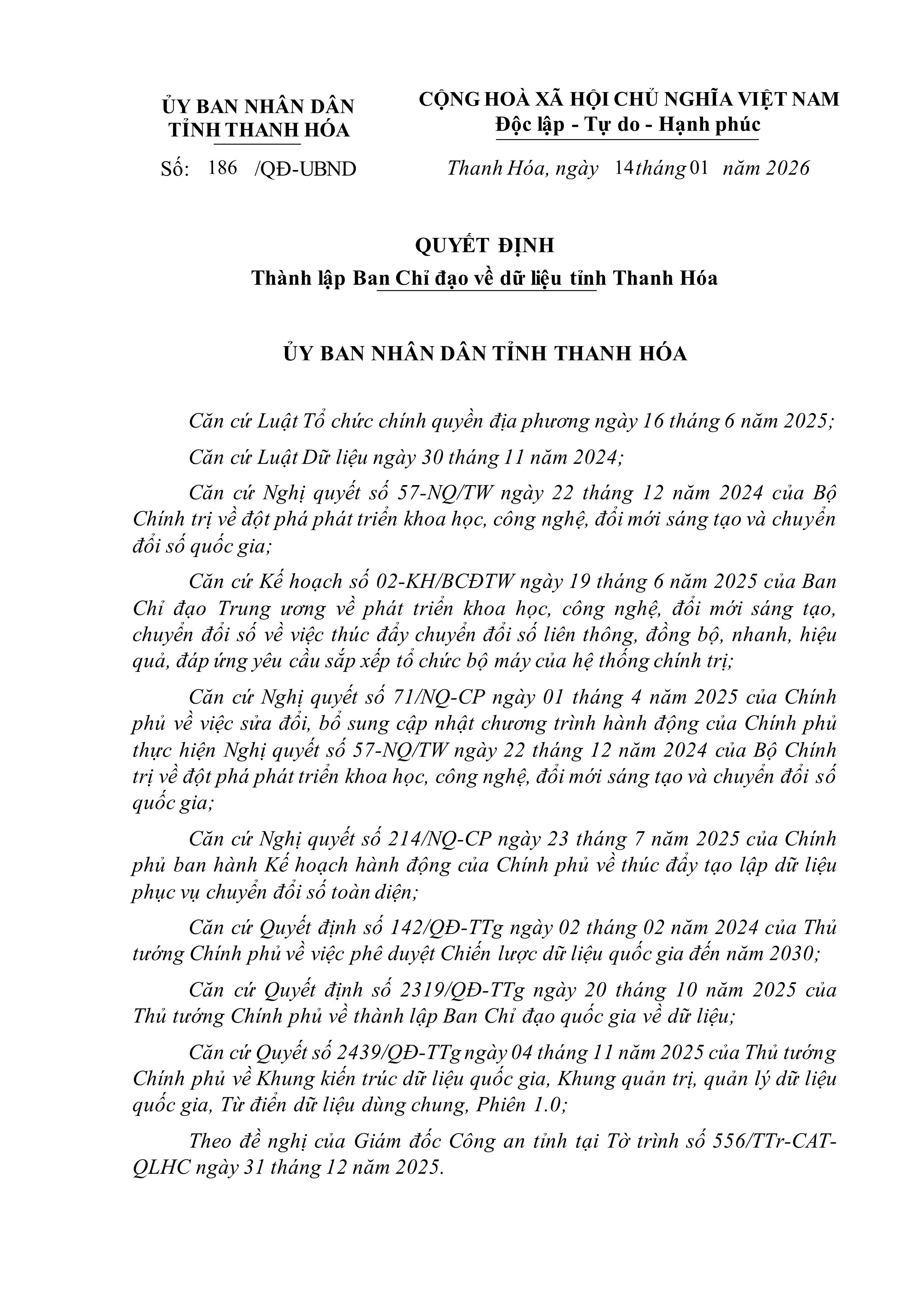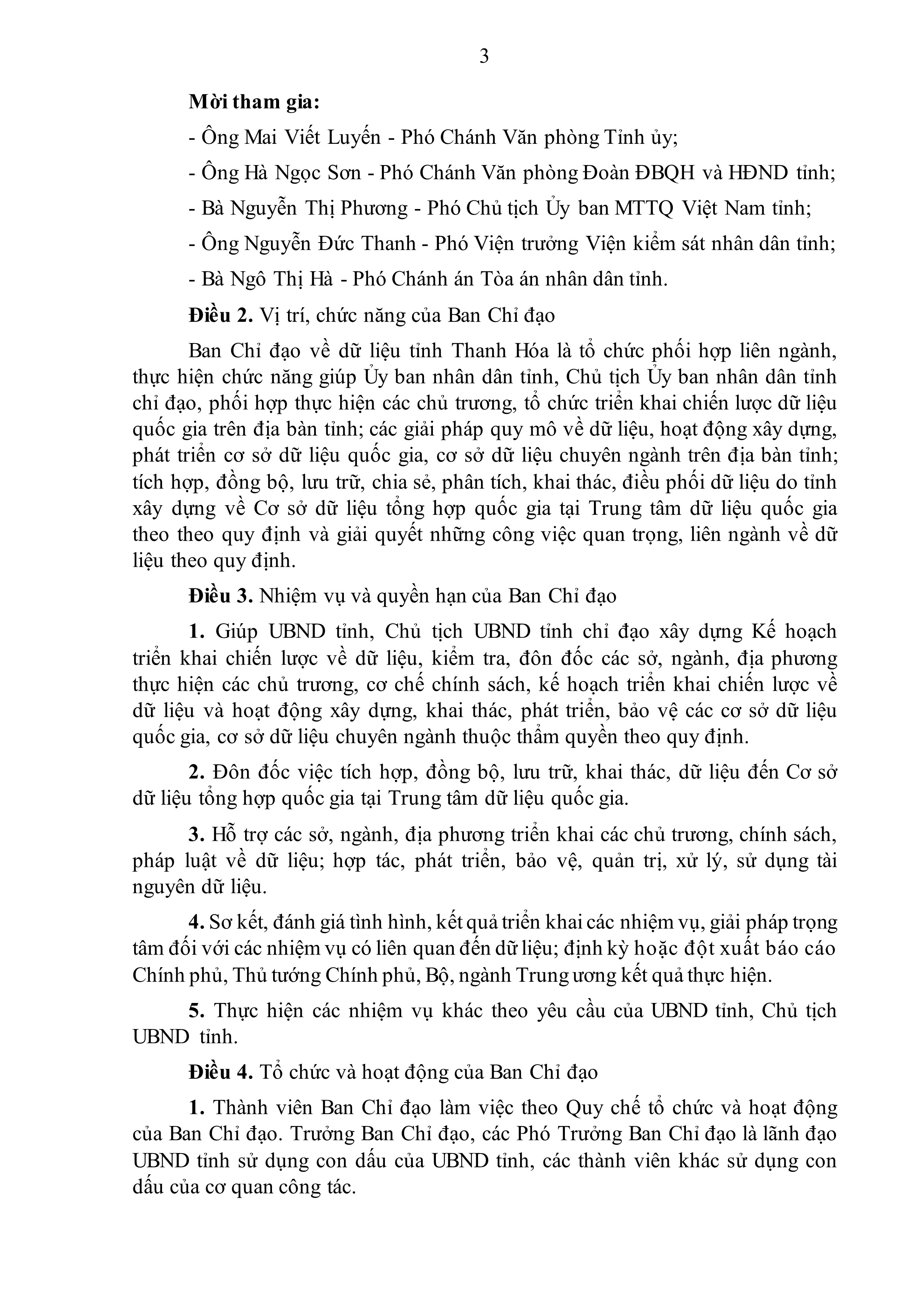 Ban Chỉ đạo về dữ liệu tỉnh Thanh Hóa là tổ chức phối hợp liên ngành, thực hiện chức năng giúp UBND tỉnh, Chủ tịch UBND tỉnh chỉ đạo, phối hợp thực hiện các chủ trương, tổ chức triển khai chiến lược dữ liệu quốc gia trên địa bàn tỉnh; các giải pháp quy mô về dữ liệu, hoạt động xây dựng, phát triển cơ sở dữ liệu quốc gia, cơ sở dữ liệu chuyên ngành trên địa bàn tỉnh; tích hợp, đồng bộ, lưu trữ, chia sẻ, phân tích, khai thác, điều phối dữ liệu do tỉnh xây dựng về Cơ sở dữ liệu tổng hợp quốc gia tại Trung tâm dữ liệu quốc gia theo theo quy định và giải quyết những công việc quan trọng, liên ngành về dữ liệu theo quy định.