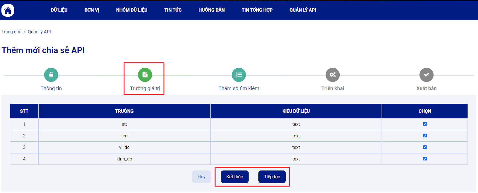 Bước 5: Tích chọn các trường giá trị, sau đó chọn Tiếp tục → Màn hình chuyển sang bước Tham số tìm kiếm