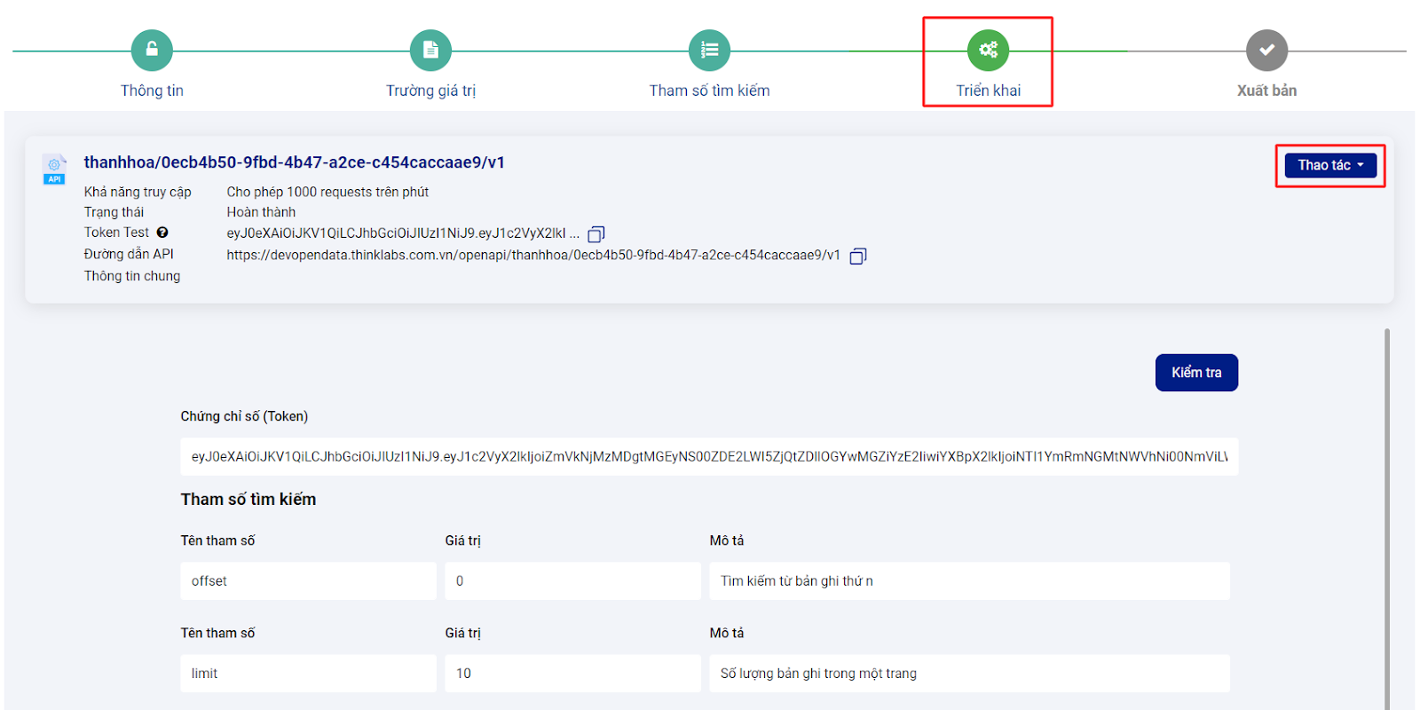 (Những API do người dùng thuộc đơn vị tạo thì không thể tự xuất bản mà chỉ có người quản trị hệ thống mới có quyền xuất bản)