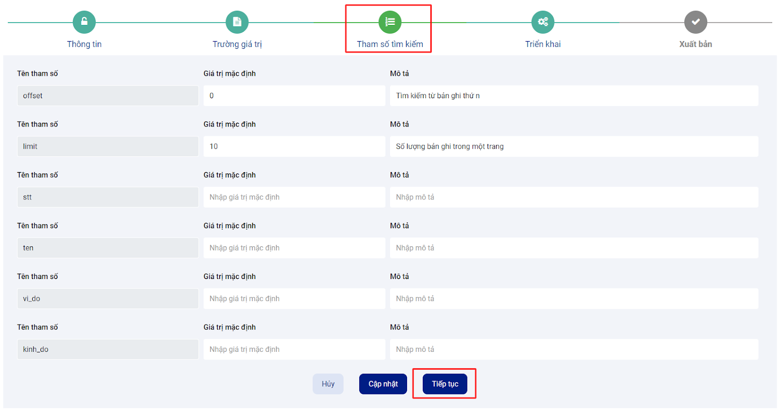 Bước 6: Nhập thông tin các tham số tìm kiếm, kích chọn Tiếp tục → Màn hình chuyển sang bước Triển khai